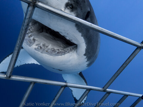 A great white shark inquisitively approaches the dive cage. Photo by Katie Yonker, featured from Bluewater Travel's Guadalupe Island Trip Report.