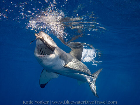 A great white shark attempts to bite a chunk of tuna on the surface before it is pulled away - a practice known as shark wrangling. Photo by Katie Yonker, featured from Bluewater Travel's Guadalupe Island Trip Report.
