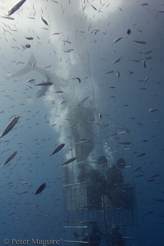 The second, more recent, incident (caught on video below) shows a great white shark that was being wrangled with bait at the surface in front of the cage. The shark, in trying to bite the bait, swims directly into the bars of the cage, which was occupied by a diver. Sharks cannot swim backwards, so it swam forward, thrashing to escape the trap it now found itself in, slowly working itself through the bars until it eventually made it through and quickly swam away. The diver in the cage exited safely afterwards.