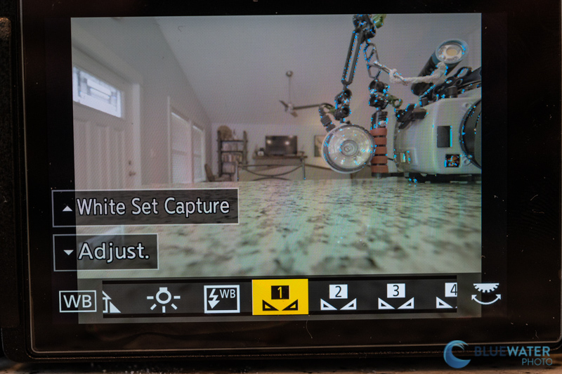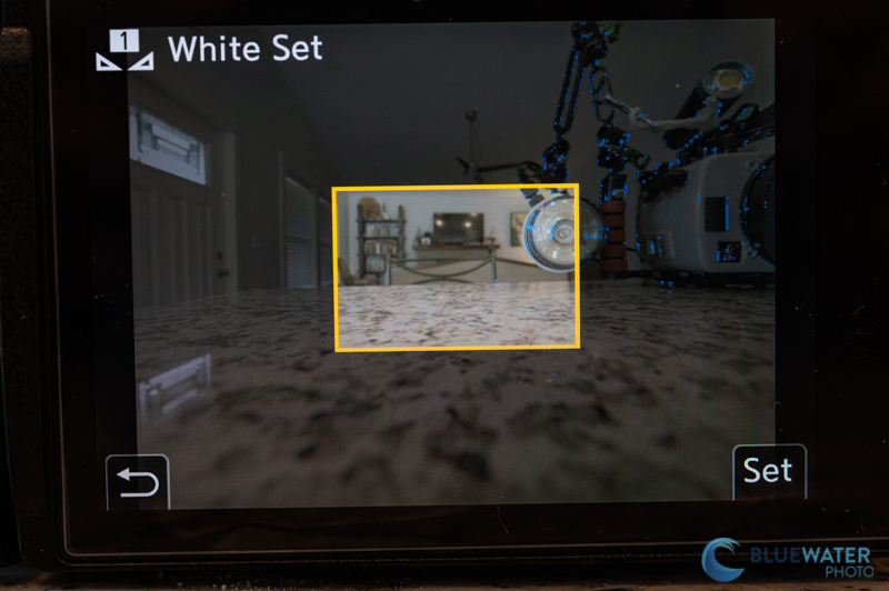 If you are shooting without video lights underwater, you'll want to set a manual or custom white balance. Setting a manual white balance with the GH6 is easy. To do this, click the white balance button on the top panel of the camera. Then you scroll to the custom white balance setting ("white set 1"). Click the up button on the D-pad and then the "ok" button in the center. This will bring up a box. Line the box up with your grayscale card underwater and click "ok" to set the white balance.