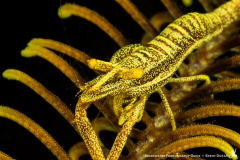 We see crisp detail on this crinoid shrimp shot at the minimum focus distance. Anilao, Philippines with Canon 7D Mark II.