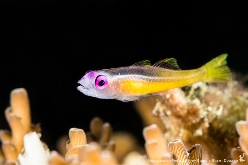 A pinkeye goby swims just above some coral. While close to center, I made sure to position the focus box right where the closest point of the eye would appear in the frame. Shot in Anilao, Philippines with Canon 7D Mk II.