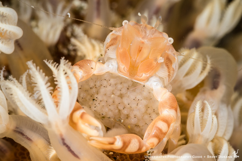 This porcelain crab is sitting on the top of a soft coral at night, moments away from releasing eggs. By clearly including the eggs and soft coral polyps in the frame, we spend an extra moment with the photo to absorb the scene.