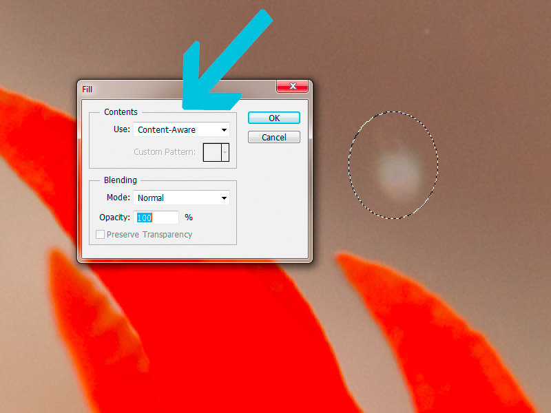 - Use Elliptical Marquee tool to select spot(s)