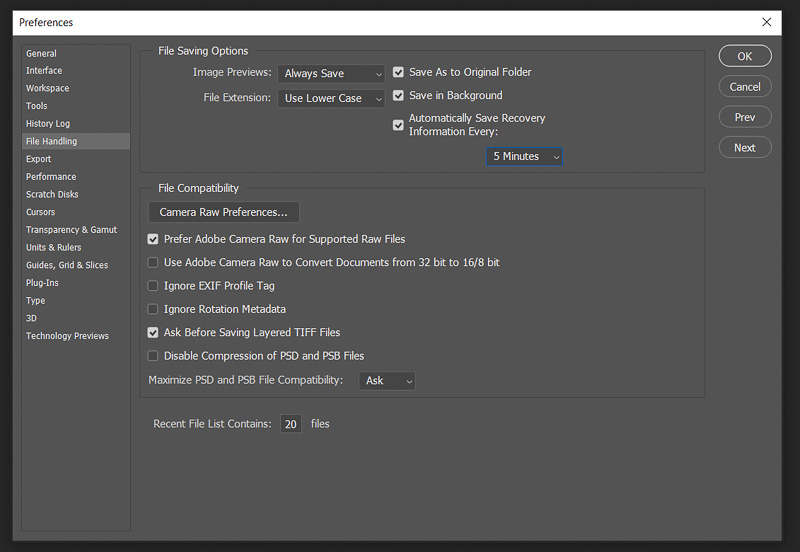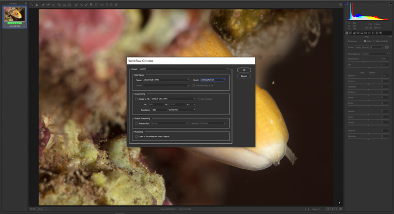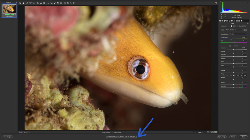 To begin, let’s take a RAW image of a dwarf moray eel from the camera into Photoshop. Since it is a raw file, it will need to run through other software first such as Lightroom or Camera Raw before opening in Photoshop. Camera Raw can be downloaded directly through Adobe’s website and works in junction with PS, initiating automatically when a raw file is opened. It is a simplified version of Lightroom, in the respect that it offers the same editing functions but lacks the organizing tools. To set CR as the default launch for opening raw images in Photoshop CC, go to Photoshop > Edit > Preferences > File Handling > Camera Raw.