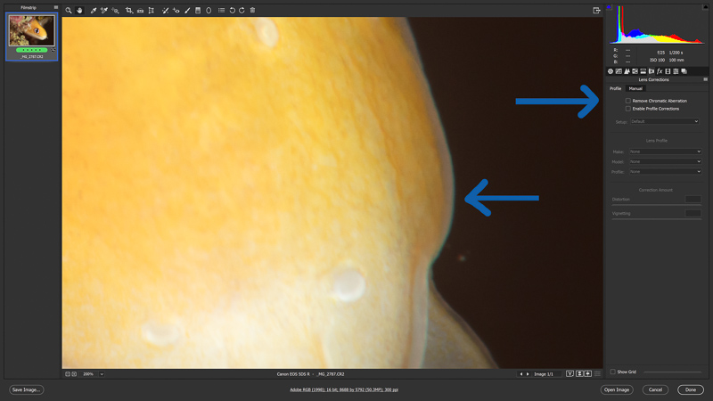 One key edit that I recommend applying in CR as you’re importing into Photoshop (it can be done in LR as well) is correcting the chromatic aberration. Check to see if color fringing exists on your photo by zooming in to around 200%. Chromatic aberration can make an image look a little blurry and often gives off strange hues around high contrast areas. In my Prep for Print article I go into why this is an important step. Simply check the chromatic aberration box located under the lens corrections tab in either Lightroom or Camera Raw. It is usually taken care of at this point but you can strengthen the effect with the sliders if needed.