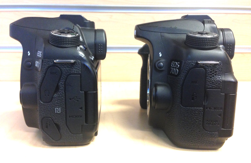 On the left side, the 80D now features a headphone jack (the 70D does not). This is great for "serious amateur" videographers who want to record and monitor audio internally. The older 70D pushed the shooter to accept whatever audio was recorded (no monitoring via headphones) or invest in external audio recording equipment. The E3 remote trigger port has also been moved to its own position on the 80D, presumably for landscape shooters who use a trigger but want to keep the headphone and mic ports clean and weather sealed.