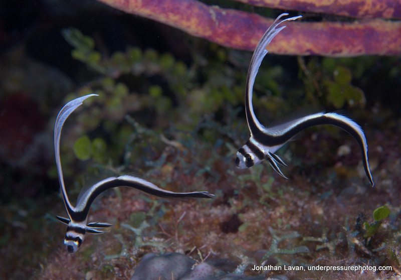 Our first shot is of a pair of juvenile Spotted Drums from Grand Cayman in the Caribbean. Adult Drums are usually solitary but juveniles are almost always found in pairs or larger groups. They have the wonderful habit of swimming around each other in little circles. Their dorsal fin and tail fin are very long and flexible (they shrink in length with age) and are constantly changing position and angle. Their black and white color on the colorful background of the reef also makes for a nice capture. They are usually found in medium depths, hiding in little depressions in the reef frequently in front of or amongst the spines of the black Long-spined Sea Urchin.