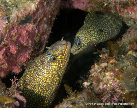 Now we will move to the Sea of Cortez off the Midriff Islands. Taking photos of Moray Eels is always a good starting place for the novice underwater photographer as they are dynamic in their look and tend to be quite stationary. However in most areas where they live they are solitary. In our second shot we find a wonderful exception. A pair of beautifully patterned and colored Jewel Moray Eels. Whether this is a mated pair, an adult and a juvenile or just a couple of eels remains to be seen. The most common opportunity to shoot eels you find together is side by side, so to find these eels juxtaposed like this was rare and naturally made a well-composed shot.