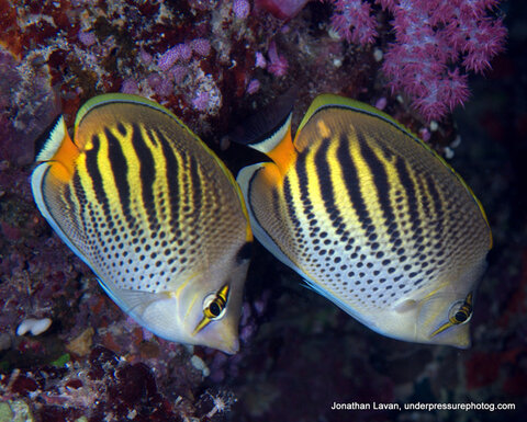 Our next couple of shots come from Fiji. Fiji is not far from the Coral Triangle, and is the source of life on earth and an area of incredible bio-diversity. Butterflyfish mate for life so are a fish you will almost always find in pairs. In the Caribbean there are half a dozen different species while in Fiji and surrounding areas there are over 80 different species - so many opportunities for finding pretty pairs. These Dot & Dash Butterflyfish are particularly colorful. Butterflyfish tend to dart around quite a bit, so it is good advice to approach slowly, keep changing your angle in relationship to the fish, try to move in one continuous motion and take plenty of shots. It is often hard to get both fish in the frame so you will need to be patient. Take enough time to experiment and try out different lens to see what will work best. A 60mm will give you clean framing of a pair while a 105mm will get you closer to your subjects without spooking them.