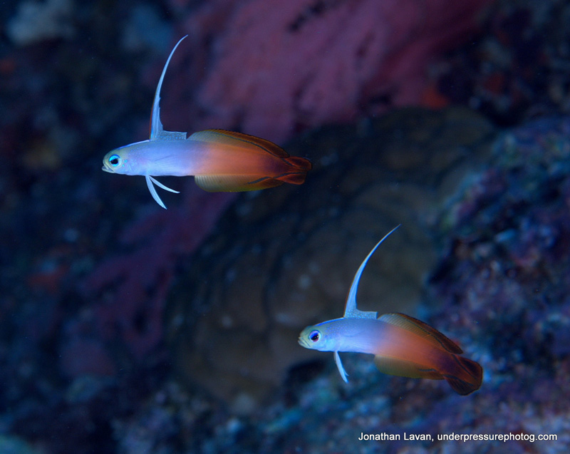 Dartfish and Fire Dartfish in particular are beautiful and found only in the Indo-Pacific. It can be a bit challenging to capture a shot because, as their name would suggest, they have a bad habit of disappearing very quickly into a hole in the ground. The female hovers closer to the burrow than the male and will dart into it first, so you may only have seconds to grab the shot. As always, patience and becoming one with the water are your best advice.
