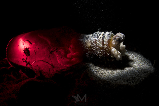 Retra flash used to illuminate the octopus while the bottle is backlit with a torch. Coconut Octopus- Anilao, Philippines. Nikon D500, Nauticam Housing, 1x Retra Flash w/Retra LSD Snoot, Sola 800, Nikonos 13mm