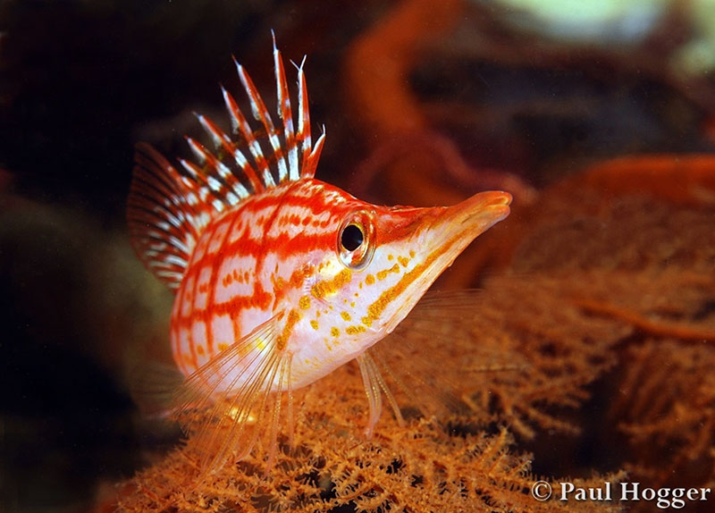 In the long calm and protected inlet towards the main town of Kalabahi, the macro/muck diving is excellent. Most sites have a rocky sloping wall before levelling out onto the black sand at around 20m/65ft. This provides a large diversity of subjects on both substrates. This shot is of a Long Nose Hawkfish in the soft corals on one of the walls. Nikon D80 & Nikon 60mm Macro Lens.