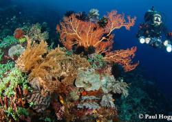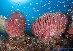 The southern area has the largest and healthiest sponges we have ever seen. It is interesting to note that when the tide floods in from the Banda Sea in the north, the water is warm and it is possible to dive in just a thin lycra suit or even less. Hours later when the tide turns and floods in from the Indian Ocean in the south, the water is significantly colder and full length wetsuit of at least 3mm is required. Nikon D80 & Tokina 10-17mm lens.