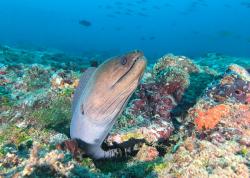 Twin Tunnels is named for two big vertical lava tubes in the sea mount. The tubes are next to each other; you can pick either and swim down to where they join and open up on the side of a reef wall at about 36m. The walls of the lava tubes are covered in fans and whip corals, and occasionally you find nurse sharks resting on the sand at the bottom. This dive is great not only for the lava tubes, but for the huge schools of fusiliers that constantly school around the entrance to the tunnels, and the fabulous reef on top. You can find pygmy seahorses in the fan corals, hairy squat lobsters live in the edges of the barrel corals, and it’s a great place to find cuttlefish, octopus, and eels.