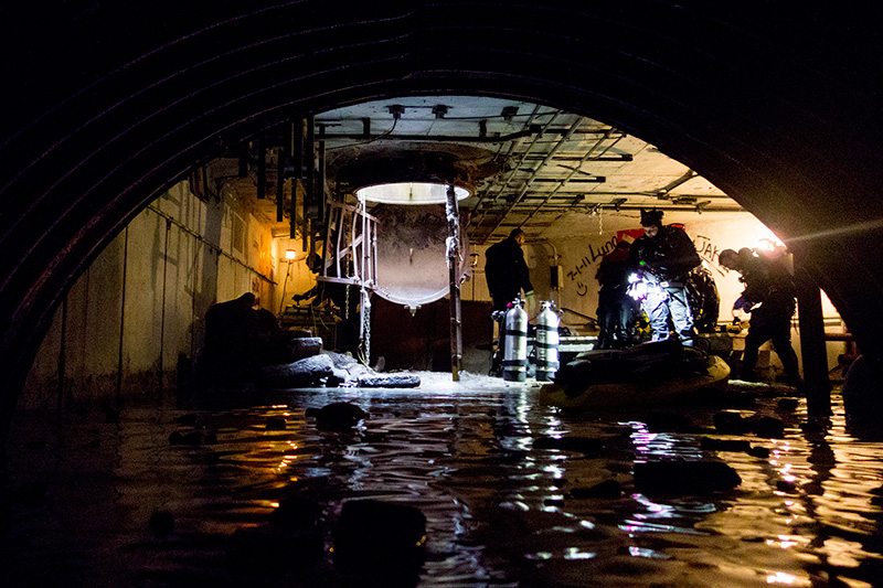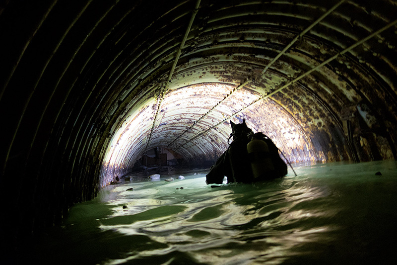 The silo complex was not prepared for divers like an artificial reef is. There are a lot of things hanging, protruding, and could prove hazardous. You need to have your eyes open as you carefully step over pipes and cables, waist-deep in water, wading your way through the tunnels on your way to the silo entry point. The guide recommends Advanced Open Water certification and very good buoyancy. Water flow is very slow, so stirring up the silt inside will take a few days to completely clear. If you’re there for photo or video purposes, make sure you’re the first group in that weekend!