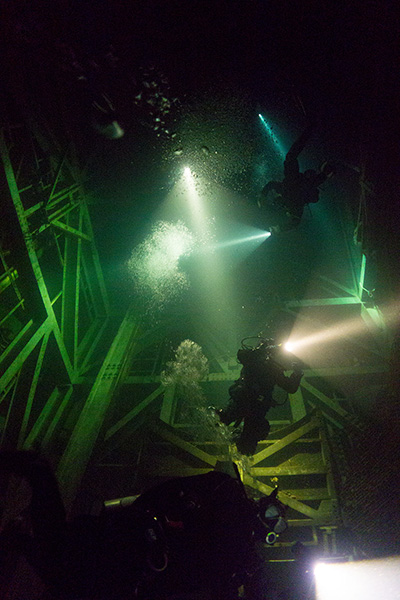 The place is a videographer's dream. We could have spent an age underwater there, moving behind cables, grids, launch platforms, and old equipment. It’s like a gigantic movie set.