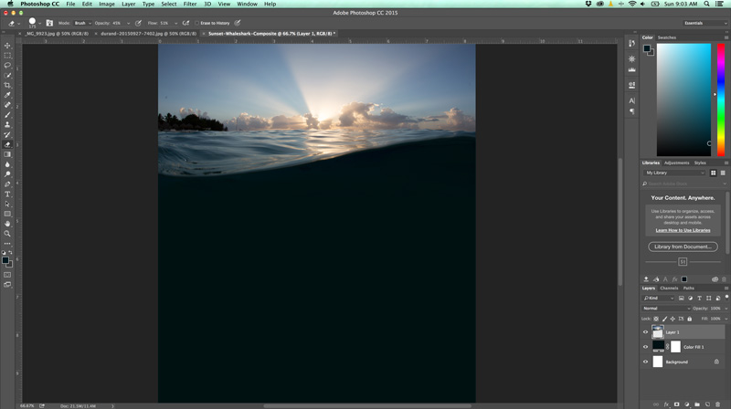 You'll notice that we have some shadows from the reef under the split-shot that are a dead giveaway of the composite. You can remove them easily by making sure you have clicked on the topmost layer (the split-shot photo layer) and then selecting the eraser tool. Simply pass the eraser tool over these areas to erase them, leaving the solid water color from the layer we sampled in step 2. Be sure to experiment with the opacity, flow and hardness of the tool in order to blend the erase marks and create a smooth transition between layers.