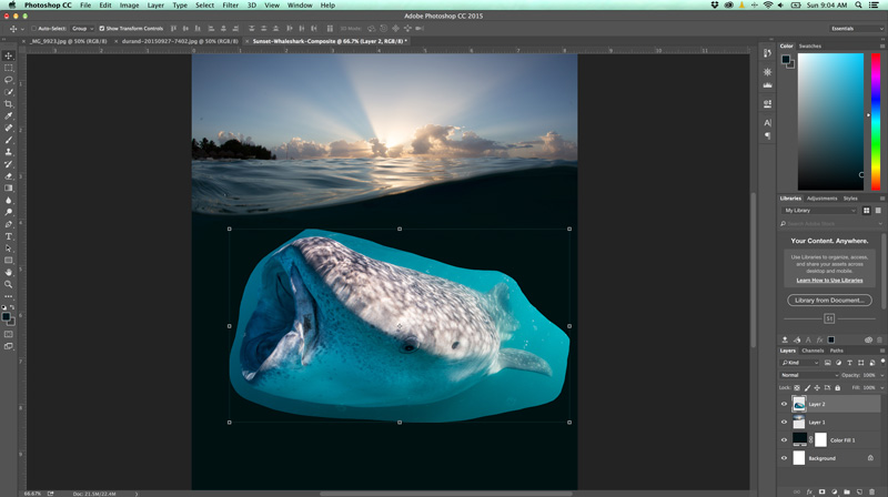 I spent 21 minutes last Sunday combining the two photos below into one scene. The split-shot is pretty standard but has no interest below the surface. The color/lighting below the surface is pretty even, which makes adding the second image much easier. I have tons of whale shark photos just sitting in Lightroom, so I picked one that complemented the wave in the water of the split-shot, gives the image a chance to live outside of Lightroom.