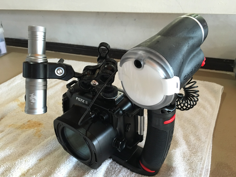 The housing accommodates several lighting setups. You can use the G7 X Mk II built-in flash with a Fantasea diffuser, or pop the diffuser off and insert the fiber optic cable holder, which accommodates two fiber optic cables. The housing port has 67mm threads, allowing you to screw in wet diopters for macro shooting or a wide-angle wet lens for the big animals.