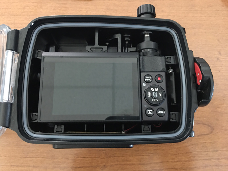 The Fantsea FG7X II features two o-rings, which offers double the protection of a single o-ring (duh!). This added security is comforting when hopping in the water. The camera is held solidly in place by the rear LCD cushion, which is mounted on springs to ensure a snug fit to the camera. Removing the camera is pretty standard when compared with other compact housings. The camera needs some pull to remove, but there's enough finger space to get a grip without needing to flip the housing upside down or tape a pull tab to the camera.