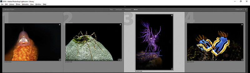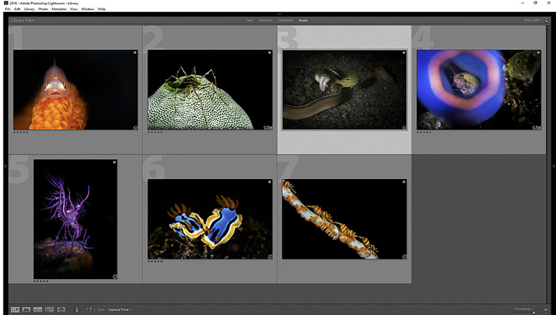 Now it is time to eliminate further. Sometimes this part of the process is difficult because you have emotional attachments to some of the images even though they might not be winning material. For example, the hunting eel image was very exciting to me because I captured the thrill of the hunt.  However, the image has several issues.  It is too dark, part of the eel's body is cut off, and it isn't tack sharp.  So I will eliminate that one.  The same is true of the amphipod inside a tunicate.  This was a difficult shot and although that carries some weight, a judge might eliminate the image because part of the tunicate is cut off, or that little piece of algae in the top right is distracting. You see, you want to choose images that are as technically perfect as possible so that a judge has no reason to eliminate it.  I would also eliminate the wire coral shrimp because the wire coral does not go perfectly from corner to corner.  That leaves us with these four images:
