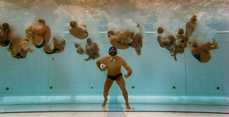 Last years winner and my personal favourite from the competition is of the Colombian U21 Underwater Hockey Team. There coach stands forefront in the shot whilst the players have all jumped in to the scene from outside of the pool. They've created another form of action, expressed this underwater sport in a unique way. The photographer, Camilo, could have taken a well framed action shot from the game, but he decided to tell a story instead, with a single photo. It's very powerful, you get drawn to the lone person at front but immediately taken away by what is going on around him. To me, it's very much like playing underwater hockey, you have to be focused (just like the front figure is) whilst there is splashing, bubbles, kicking, knocks, apnea, co2 increase and lack of oxygen all going on under the surface.