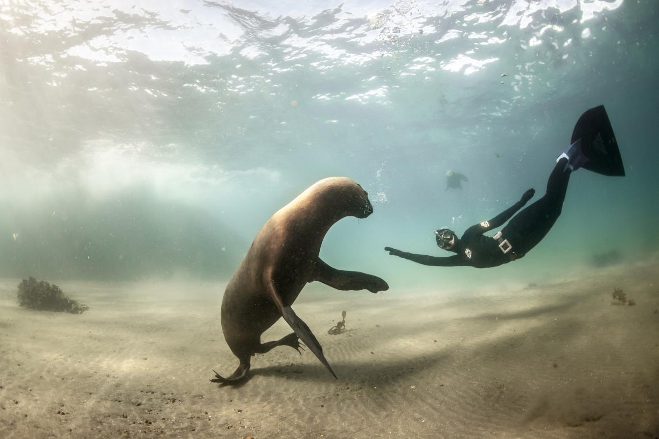 This was an organised trip, but it's still something quite rare to be able to play and hang about with these grey seals. We dive all year round, freediving and scuba and we have had many wild interactions with harbour and grey seals but have never some this close as we did at the Farne Islands. Above you can see a sea lion, they are playful animals and this photo depicts a rare interaction perfectly. A freediver swimming with the sea lion as they look at each other, both in shot and well framed showing the close proximity to each other.