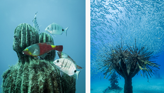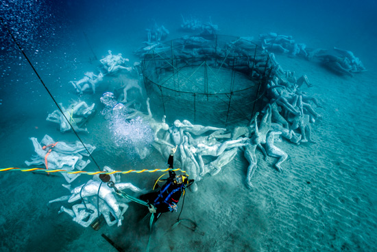 The last exhibit in Museo Atlantico is the Human Gyre, over 200 life-size figurative works creating a vast circular formation or gyre. Consisting of various models of all ages and from all walks of life, the positioning of the figures constructs a complex reef formation for marine species to inhabit and is a poignant statement for visitors to take with them at the end of the tour.