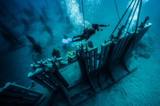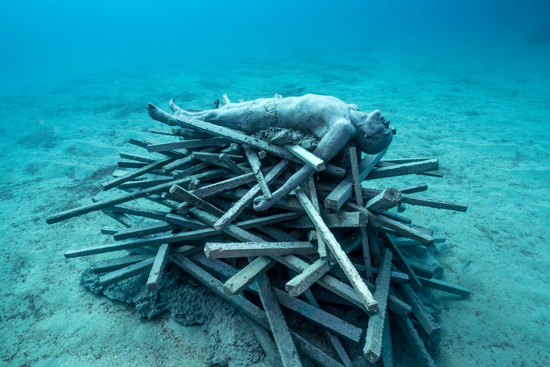 Consisting of over 300 works spread over 12 installations, it is the first time Taylor has installed large-scale architectural works. The new installations include a 100 Ton 30m long wall, an underwater botanical sculpture garden referencing local flora and fauna, and a colossal formation of over 200 life size-human figures in a gyre.