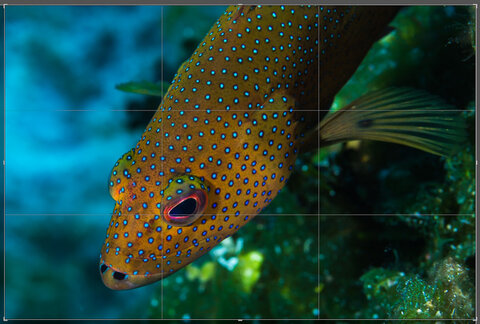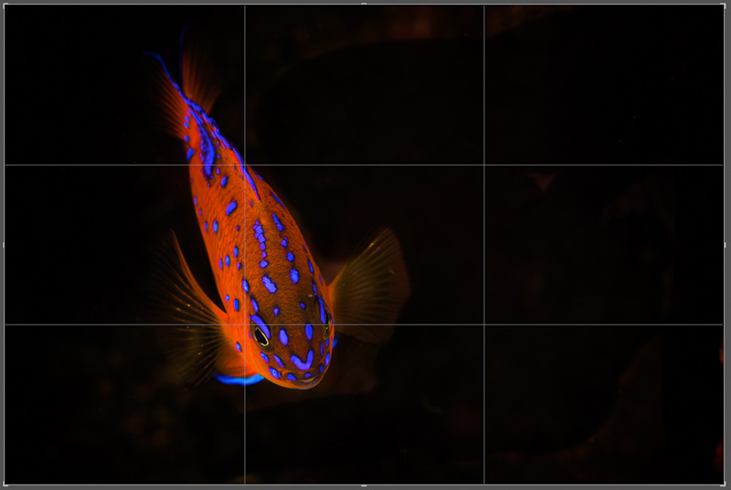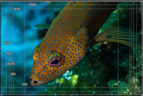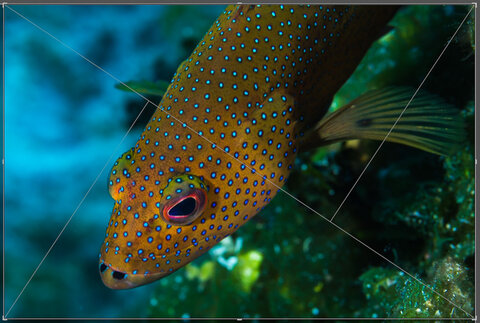 Looking for diagonal lines is another long standing “rule” to composing a photograph, and the diagonal crop overlay is great in helping to find those compositions. Below is an example of where I framed an image with the diagonal in mind. The overlay is simply shown here to reinforce that, but this overlay is very helpful for those images where a slight shift in any direction will help align the important elements. Notice the fish's eye falls on an intersection of the two diagonals (which happen to be very close to where the lines would intersect using the Rule of Thirds overlay), and the body falls directly upon the diagonal that intersects the image.