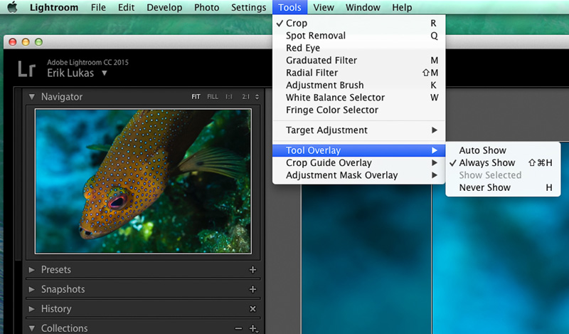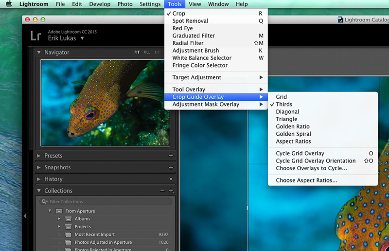 I am always looking to expand upon my Lightroom skills, so I love to share and exchange tips and tricks I have picked up with other photographers. Today I wanted to share a Lightroom feature that lives within the “Crop” tool of the Develop Module. The feature is the “Crop Guide Overlay”, which as the name implies, overlays one of seven different patterns on the image. I was surprised to find that most people really didn’t know about this tool, so I thought I would share how I use it here for Underwater Photography Guide readers.