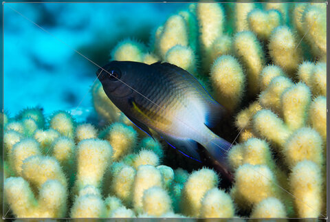 Here is another example where I composed the image to have the important elements: the eye of the Damselfish falls onto an intersecting third, and the body on the diagonal.