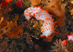 Focus - you will want to usually focus on the eyes or rhinophores. Lock focus on them and recompose. If your camera has a moveable focus point, use your arrow keys to move your focus point to where you want it. You may need to do this often if the composition changes, or your subject moves. this will help avoid a bull’s-eye composition also. Depending on the subject and how easily my camera is focusing, I will switch between C (continuous) and S (single-shot) focus modes. Luckily my housing allows me access to this switch. C mode allows me to shoot without the camera "locking" focus, which can be difficult when shooting supermacro.