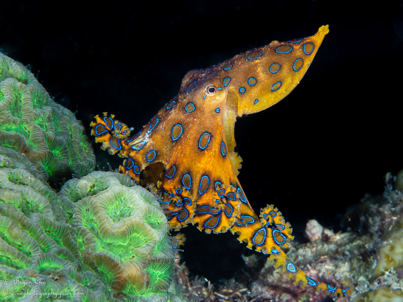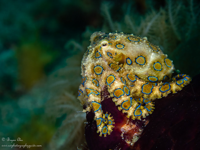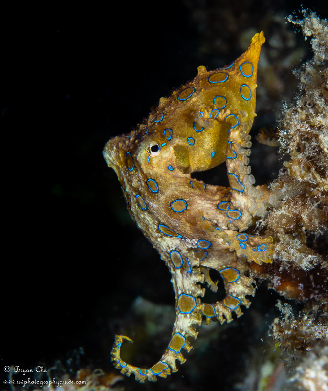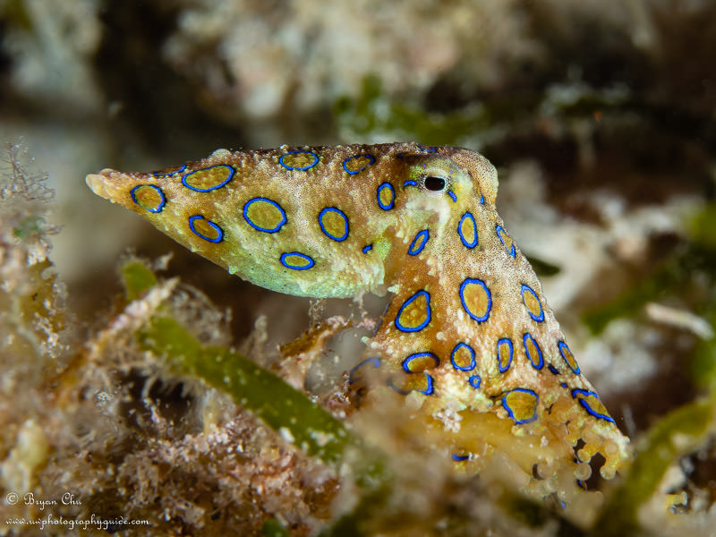 Blue-ringed octopus at Chocolate Island. Olympus OM-D E-M1, Olympus 60mm macro lens, Nauticam housing, 2x YS-D1 strobes. f/10, 1/320sec, ISO 200.
