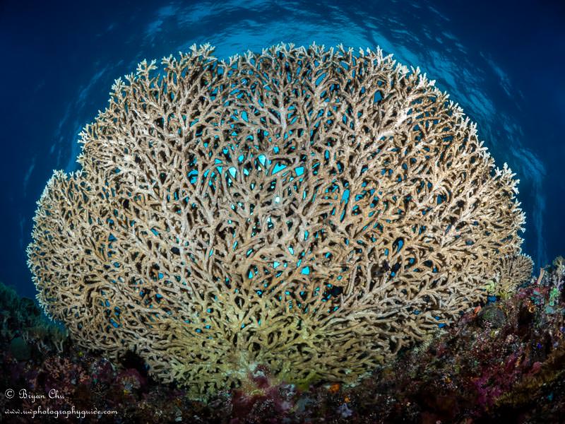 Table coral at Capitancillo. Olympus OM-D E-M1, Olympus 8mm fisheye lens, Nauticam housing, 2x YS-D1 strobes. f/16, 1/320 sec, ISO 200.