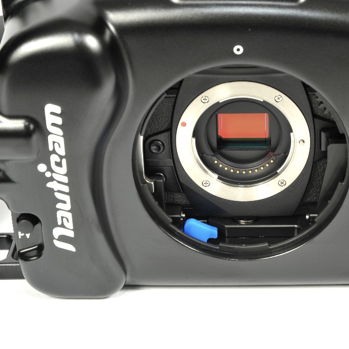 The iconic Nauticam port locking lever allows effortless port changes.  No twisting required, just press and lock.