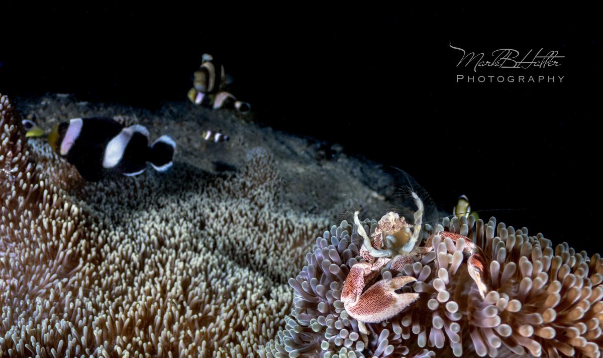 3. As you move the main subject away from the front of the objective lens, depth of field increases considerably. Images 3 and 4 demonstrate this; image 3 shows the main subject porcelain crab at nearly one-to-one with the secondary subject anemonefish out of focus. The crab in image 3 was shot almost touching the lens element. Image 4 shows the secondary subject anemonefish in sharp focus with the main subject porcelain crab. The crab in image 4 was shot about 2 inches from the lens element.
