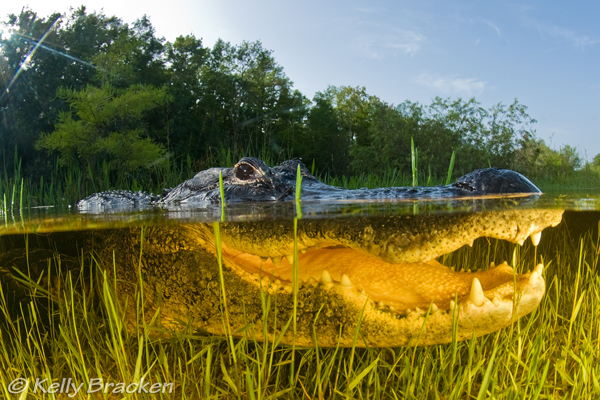Alligator, photo by Kelly Bracken. Nikon D200, F11, 1/125th, ISO 200. tokina 10-17mm lens at 11mm, inside a Sea & Sea 9 inch acrylic dome port. The mouth of the gator was only an inch from the dome port. Strobes were underwater, pulled far back and turned down low to avoid blowing out the subject. Subject was only in a few inches of water. This was shot "blind" meaning the viewfinder wasn't used. This shot was taken earlier in the morning, before the sky got too bright and the water got silted up. Clearly she had some chemistry with this alligator. Care had to be taken to shoot a "level" shot, not to overexpose the gator, and not to get the sun into the photo too much. One person also tried rigging up a pole-cam but it was decided it was better just to squat down with the camera. Nowadays I'd use a Nikon D850 for this shot.