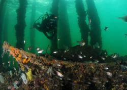 Divers in a lake in Switzerland. F16, 1/125th, ISO 320. Photo by Michel Lonfat. Again, shooting at F16 allowed the over and under portions both to be in focus. The closer the subject is to the camera, the smaller the aperture needed to accomplish that. Michel bumped his ISO up to 320 to allow him to shoot at the required F-stop, and maintain a fast shutter speed. A nice sunny day allowed the sky to be blue at F16. Because he used the flash, and a fast shutter speed, the water behind the divers is black.