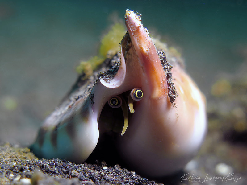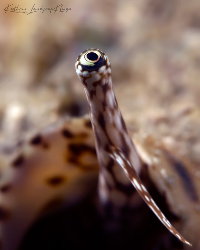 Another example is a close-up shot of only one eye of a huge Conch snail we spotted while diving in Pemuteran, Bali. Many people take good “both eyes shots” of conch snails. However, this Conch snail was so huge that this shot was nearly impossible – even without macro lenses - because the eyes were coming out of the huge shell on different sides. So I concentrated on only one eye of the snail instead. The biggest challenge with this shot was having to be really, really patient. The Conch snail was very cautious and moved its eye out of its shell very slowly. So, I set my focus and strobes up, and then had to wait a bit for the eye to move into the right position. The result was a Conch snail eye reminding me of a telescope, with only the upper part in focus.