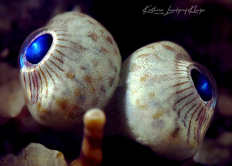 Here are two examples for this. The first one is a close-up shot of the eyes of a Carpet Sole we spotted during a night dive in Lembeh Strait. Carpet soles are well camouflaged and really hard to separate from the background, especially when you are an amateur photographer and not that experienced with strobe positioning and light settings. That may also be the reason why I thought they and other flatfishes are boring and not so good for photos. After trying to get some “whole fish shots” of this one, I decided to go only for the eyes because they are special… really huge compared to the size of the fish, and with a blue tint in them. I loved the result, with all the details clearly visible!