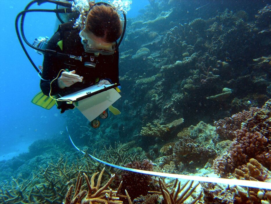 Reef Check Diver collects data on coral bleaching and other ecosystem health indicators along a transect.