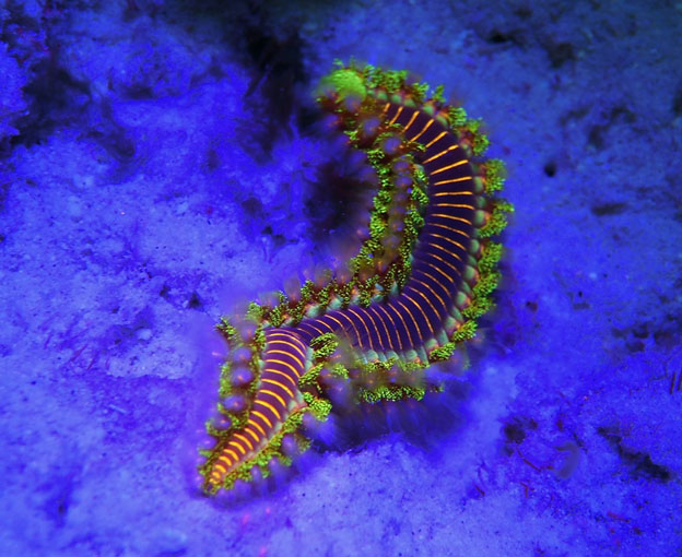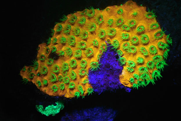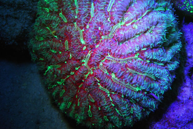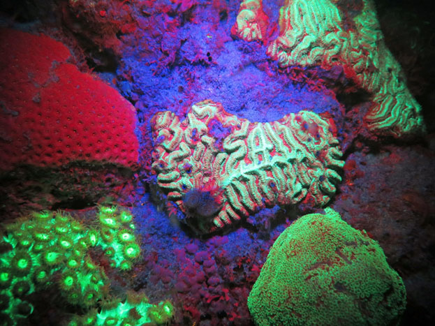 Here’s how Fluorescence or Fluoro diving works: The light’s Royal blue LED’s emit blue light in the range of 450-460nm that is in the approximate wavelength range to “excite” the fish, reef and organisms into making a light filled energy response; SeaLife adds a finely tuned and proprietary dichroic filter that pinpoints the exact light wavelength to get the highest energy response from the underwater subject results, revealing vibrant fluorescent colors of underwater creatures.