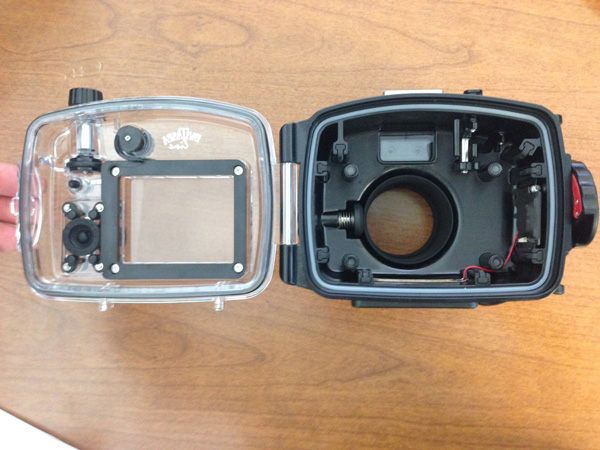 The Ikelite housing is a classic, back to basics underwater housing. Completely clear it allows you to see the o-ring seal as well as how your buttons are interacting with the camera, which makes troubleshooting any issues fairly simple. Controls are not moved and can be more difficult to access, but everything works smoothly and consistently. The biggest issue I have is that the zoom control is not spring loaded, which means once you reach the desired zoom level you need to turn the knob back to center to stop the camera from zooming in further. The shutter is OK, but not as sensitive as other options and the housing is definitely largest out of all choices. One nice benefit is that it is made in America and they have great customer service and support with their housings.
