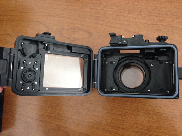 This housing feels *slightly* little bigger than the other aluminum housings. It has 2 bulkheads so you can use a vacuum system or a video monitor. I found it a little harder to handhold in 1 hand, and if you did the record button could be easily pressed accidentally, but not that easily. It has a hot shoe and 1 screw-in mount point on the side. The buttons labeled really nicely, and it has a leak detector. It has some nice features that make it worth the price it is at.