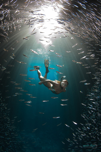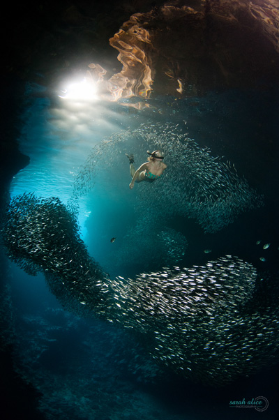 Our first visit was during a busy time and a few boats had entered into the space. With snorkelers everywhere I knew that we would have to come back to shoot at a quieter time, and that the image I wanted to create would need a little setting up. Luckily Cath (who agreed to model for me) and another photographer were able to visit the cave at such a time and I had the opportunity to play with the strobe positioning in correlation to the sun entering the caves entrance and decided how best to direct the subject. With the unpredictability of the bait fishes movements we were required to make dives over a period of approximately forty minutes but we knew we had the shot.