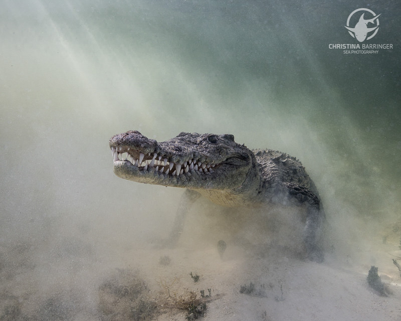 We all know the secret to underwater photography: get close! The “smartest” way to get close to these crocodiles is to approach them dead on, directly in front of them. When they strike they snap to the side, they don’t lunge forward with a bite. Directly to their side, (comparable to the blind spot of a car) is the danger zone and if you enter that zone you will get a quick tap on your shoulder from your croc expert letting you know it’s time to back up.