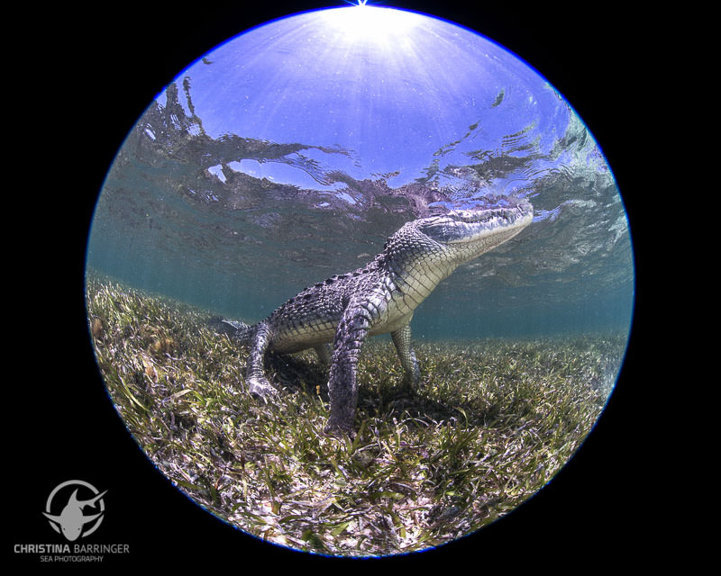 You will notice a “seagrass bed ledge” just before the sandy patch starts. When the crocs are at the edge of this ledge, it’s easy to carefully approach and get excellent shots with an upward angle, beautiful sun rays in shallow water, with minimal backscatter [depending on conditions (try not to shuffle and kick up the sand that you’re in). When multiple crocs move in, be extra cautious. Your croc wrangler expert will inform you if it’s best to exit the water. Crocs are territorial and if a fight breaks out, walk backwards towards the boat.
