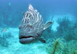 F7, 1/160th, ISO 500. 2 meter long giant black sea bass, fleeing the scene. Unless they are in a mating/cleaning area, most black sea bass are quite skittish.